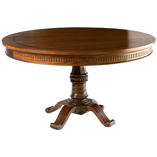 Timeless antique reproduction dining table with hand carved pedestal base & parquet inlay top. Perfect for dining table or foyer table loaded with your favourite objects. Seats 4-6 persons.